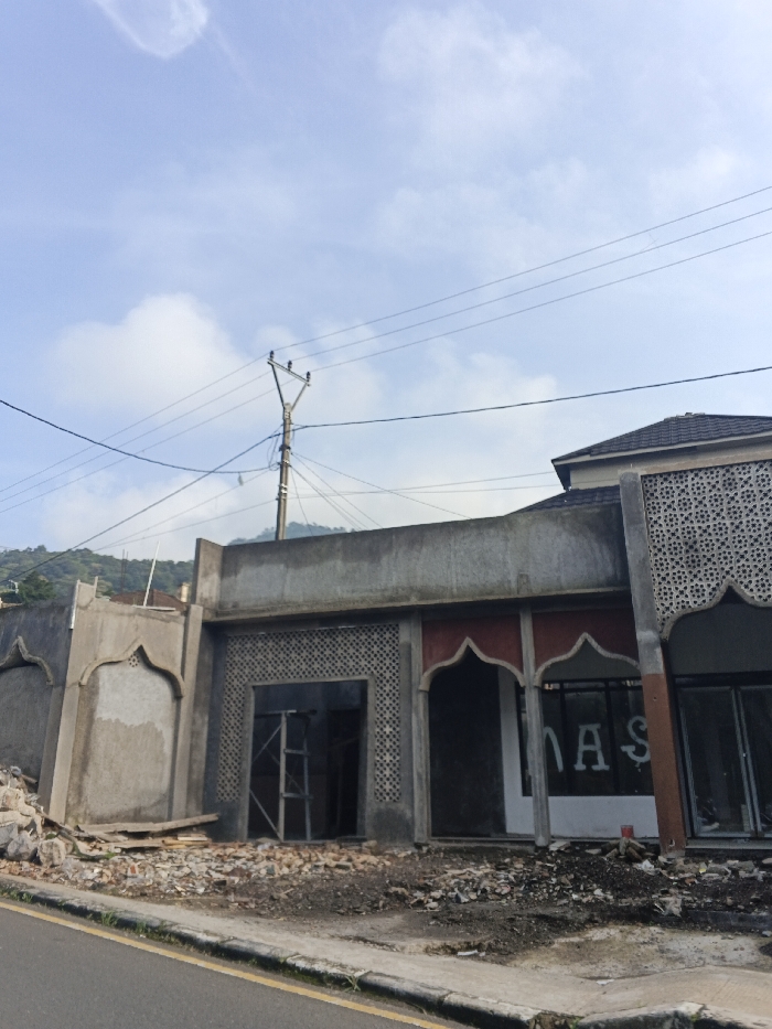 The image displays a street scene in Basedth, Cambodia, depicting a row of buildings in various stages of construction or renovation, viewed from across a road. The sky is partly cloudy and light blue. In the background, green, tree-covered hills are visible. A paved road with a yellow curb line occupies the bottom left. Adjacent to the road is a dirt and debris-strewn ground area extending to the building facades. A tall utility pole with multiple power lines runs vertically in the upper-center, with wires stretching horizontally across the frame. The buildings feature concrete facades. The leftmost visible structure is a rough concrete wall with a pointed archway design. In front of it, piles of broken concrete, bricks, and wood debris are scattered. The adjacent central building has a large, unfinished rectangular opening, framed by a concrete facade with a geometric latticework pattern. Scaffolding is visible within this opening. To its right, another building section features a prominent pointed archway with a reddish-brown inner curve and a dark recessed opening. Further right, a partial view of a building shows a decorative patterned screen above a dark shopfront, displaying large white letters "MAS". The roof of this rightmost building is dark and tiled. No individuals are present in the scene.