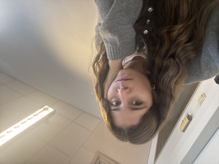 The image displays a young adult female situated indoors in what is identified as the city of Porto Salvo, Portugal. The subject has long, wavy brown hair and a light complexion, looking directly at the camera with a neutral expression. She wears a light grey knit cardigan with white buttons over a white top, a small gold hoop earring in her left ear, and a thin gold necklace. Her left hand rests against the left side of her face. The background on the left reveals a section of a light-colored wall or door frame with two light-toned rectangular objects mounted vertically. The upper right background features a white grid drop ceiling and a brightly lit rectangular fluorescent fixture emitting warm-toned light. The wall beneath the ceiling is a plain, light grey color. The scene is illuminated by artificial overhead lighting.