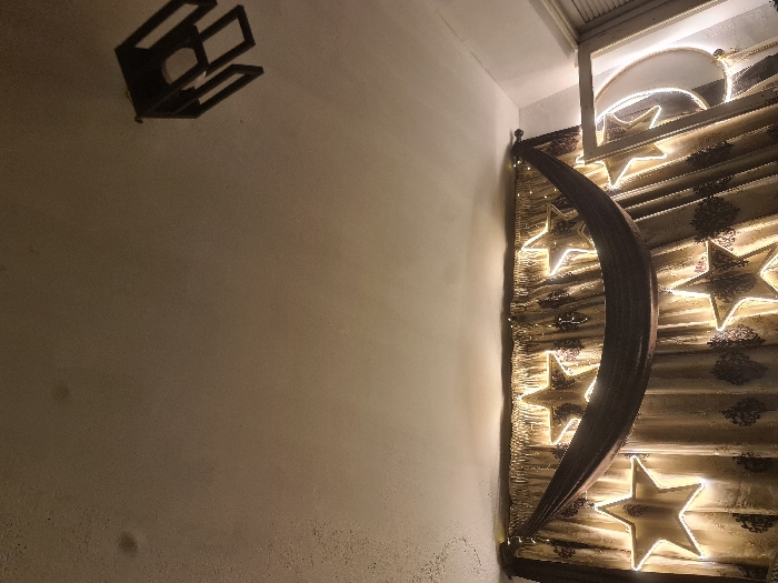 A room's corner features a wall-mounted black geometric light fixture. Adjacent is a decor item with illuminated stars and a crescent shape against a patterned backdrop. The space above shows glimpses of a window. The overall scene is lit by warm, diffused light, casting shadows on the white walls.