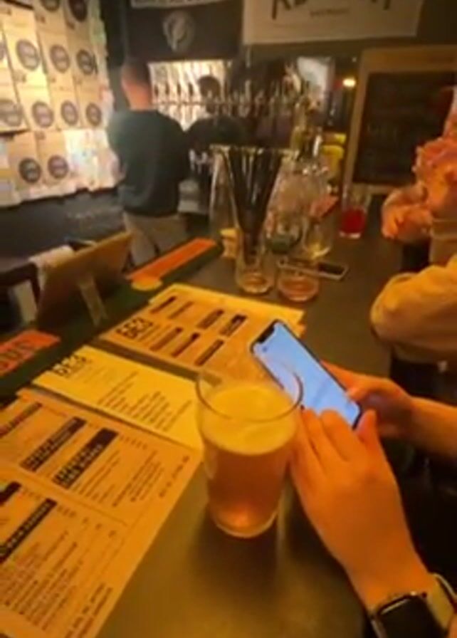 The camera pans across the bar of a restaurant or pub, revealing a patron using their smartphone, sitting next to a glass of light beer and a menu