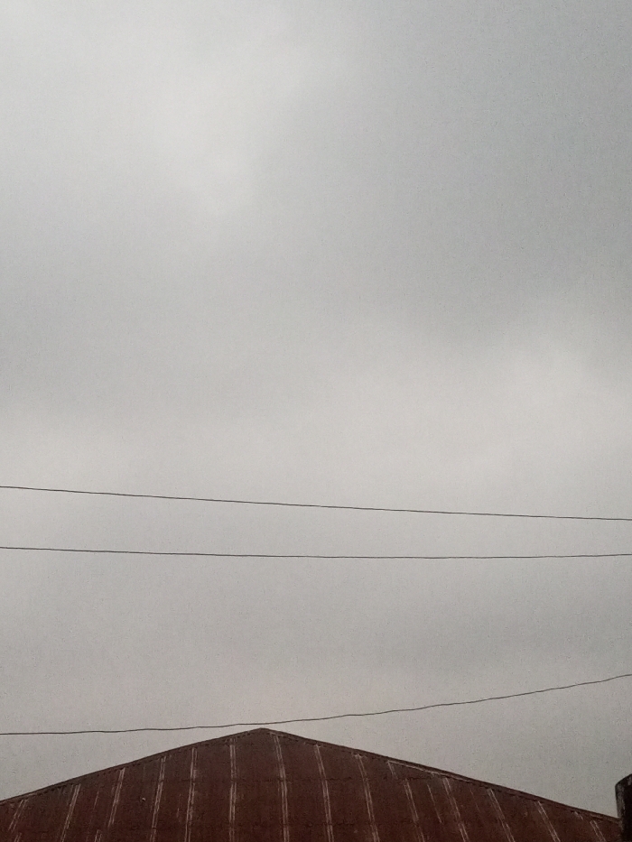 A grey sky filled with dense clouds dominates the view, obscuring any glimpse of the sun. Three electrical wires stretch horizontally across the frame, adding a sense of perspective. Below, the peak of a rusty, corrugated metal roof is visible. The scene is devoid of bright colors, creating a somber and somewhat desolate atmosphere.