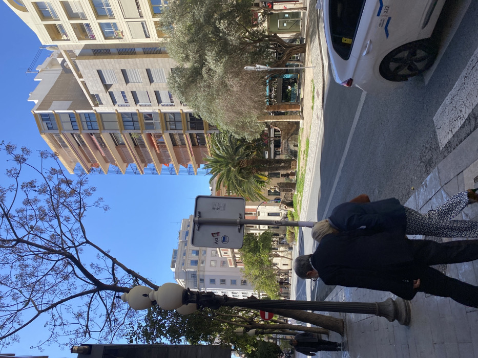 The image captures a street scene in Alicante, Spain, at the coordinates 38