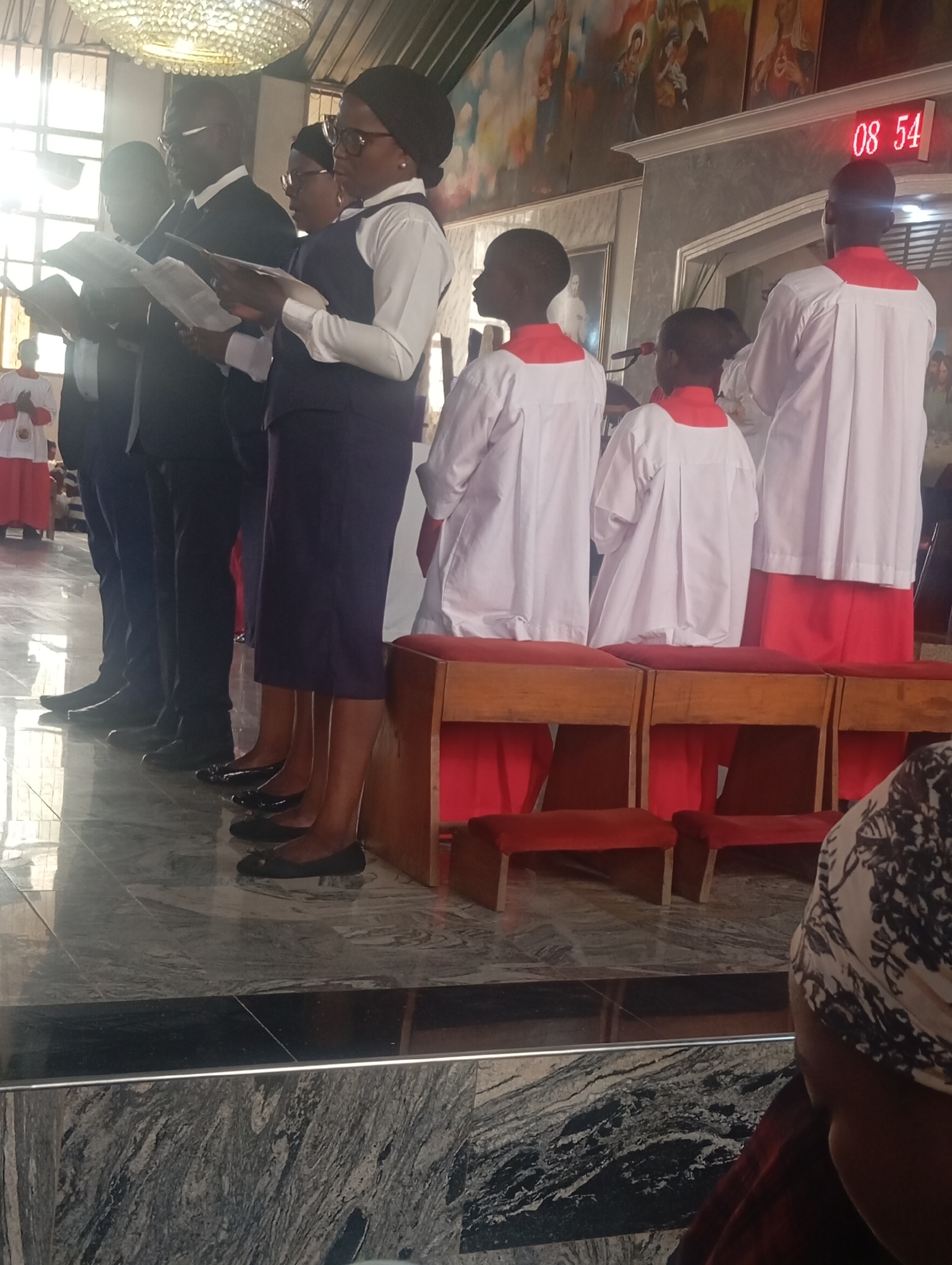 The image depicts a scene inside a church. A group of adults in formal wear, including a woman wearing a vest and skirt, are standing in a line, holding books and appearing to be singing or reciting. Behind them, two children and another individual in white robes with red accents are standing behind wooden pews. In the background, a digital clock displays the time "08:54." A chandelier hangs from the ceiling, and artwork adorns the walls. The location is presumed to be Markurdi, Nigeria, based on the user's prompt. The floor is marble.
