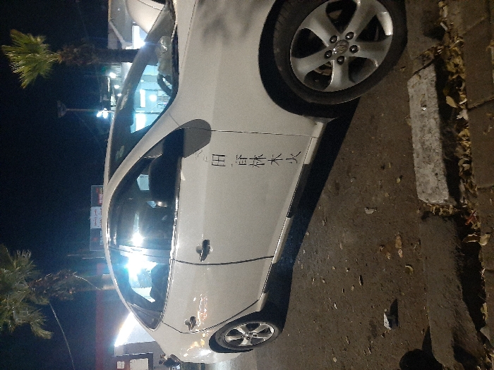 An overhead-to-ground level shot depicts a white four-door sedan, consistent with a Hyundai Elantra of the AD generation, parked at night in Barza Municipality, Syria. The driver's side of the vehicle is prominent, featuring chrome window trim and a vertical black decal displaying five Chinese characters: "田," "耳," "林," "木," and "火" between the front fender and the B-pillar. The vehicle's silver multi-spoke alloy rims are visible on both the front and rear wheels. The car rests on an uneven asphalt surface littered with small debris and dry leaves. A cracked concrete curb runs parallel to the vehicle in the foreground, bordering a narrow, unpaved strip of ground. The background is dark, illuminated by ambient artificial light sources that reflect off the car's windows. Two palm trees are distinctly silhouetted against the night sky. Faintly discernible structures and signage with Arabic script (e.g., "بنزين وتشحيم," "غسيل وتغيير زيت") suggest a commercial or service area. No individuals or active movements are depicted in the static scene.