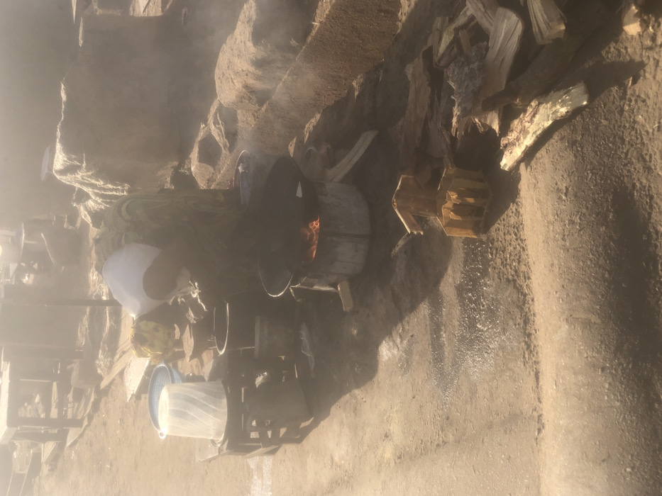 A blurry, rotated image depicts a scene of outdoor activity. A person in a white shirt works near a collection of buckets and containers. Wood is stacked nearby, suggesting a cooking or heating process. The ground is dry and rocky, with water visible in spots. Mist or smoke permeates the area, obscuring the details. The overall impression is one of rural life and labor.