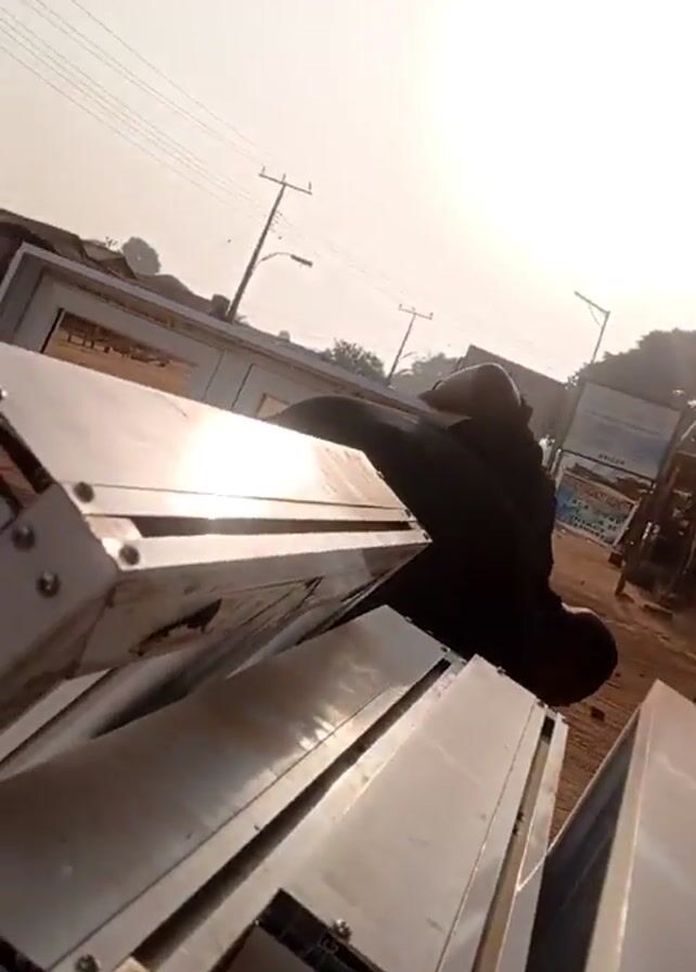 A person wearing a black shirt is working with several rectangular objects. The objects appear to be made of metal and have a shiny, possibly stainless steel, surface with visible rivets and some internal components. The person is leaning over the objects, handling them in an environment that looks like an outdoor workspace. The background shows an urban setting with utility poles, streetlights, and buildings. A sign is also visible in the background, but its text is not clear. The lighting is bright, with the sun causing a glare that makes details difficult to discern. The scene is filmed with a TECNO SPARK 20 phone.