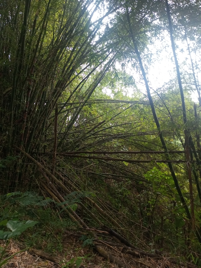 A dense bamboo forest scene features a profusion of green stalks reaching skyward, interspersed with bright light. A makeshift structure, seemingly a bamboo frame, is set amidst the thicket. Some fallen bamboo stalks lie on the ground, partially obscured by lush green foliage and leaf litter. The overall impression is of a wild, overgrown area dominated by bamboo.