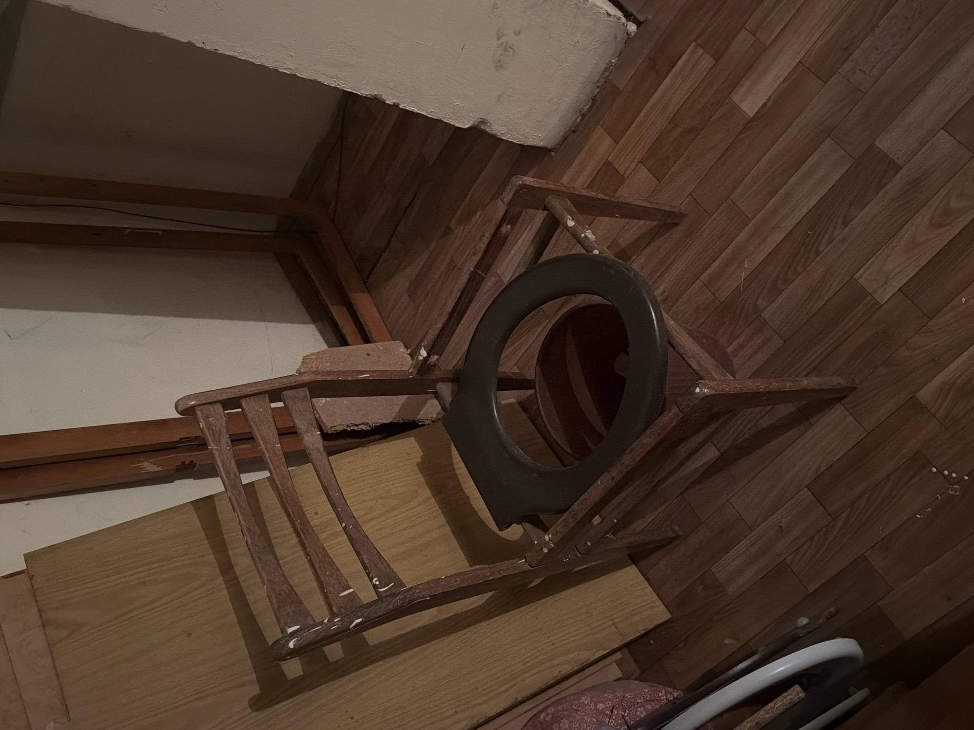 A top-down, slightly tilted perspective shows a wooden commode chair placed on a wood floor, partially covered by what appears to be plywood or other flat wooden surfaces