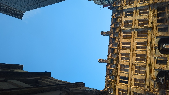The image displays an upward perspective of The Fruit Exchange, a historic four-story building located on Victoria Street in Liverpool, United Kingdom. The building's facade is constructed from light-colored, weathered stone, featuring numerous rectangular windows across its multiple levels. The uppermost story incorporates a mansard roofline with several dormer windows and two prominent dark-colored brick chimneys. On the ground level, three large arched openings are visible. The arch on the left bears a partial sign reading "FRUIT EXCHANGE" in white lettering. The central archway appears recessed, containing an indistinct, shadowed human figure. The archway to the right displays a poster or sign featuring a person's image. The sky above is clear and blue, occupying the upper half of the frame. Portions of adjacent buildings, characterized by their cornices and brickwork, are visible in the top-left and top-right corners. The scene is illuminated by direct sunlight, highlighting the building's texture and architectural details. No specific actions or interactions are clearly discernible beyond the presence of the indistinct figure.