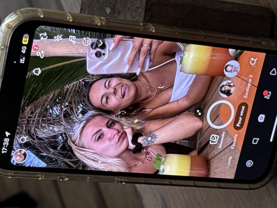 An iPhone, contained within a clear, ridged protective case, is depicted upright, displaying a social media application interface. The screen shows a front-facing camera selfie of two women in Ahangama, Sri Lanka. The woman on the left has blonde hair, pulled back, and wears a dark top. She rests her chin on her left hand, which features a prominent circular tattoo on the wrist, and exhibits a pouting expression. A dark necklace with small charms is visible. The woman on the right has darker hair, wears a white spaghetti strap top, and is actively winking with her right eye while sticking out her tongue. She is holding a light-colored smartphone in her right hand, capturing the selfie; the phone's triple camera array is visible. She wears a ring on her left ring finger and a light-colored beaded necklace with a 'K' pendant. Both women are positioned at a wooden table, with identical layered drinks in glasses in front of them, each garnished with green mint leaves. The background of the selfie features lush tropical foliage, indicative of palm trees. The iPhone displaying the image shows the time "17:38," a "4G" network indicator, and "68%" battery life. The social media interface includes various icons for notifications, user interactions, and multimedia options. The central portion of the screen displays a large white circle, presumably a capture button, surrounded by navigation text including "Pour vous" (For you).