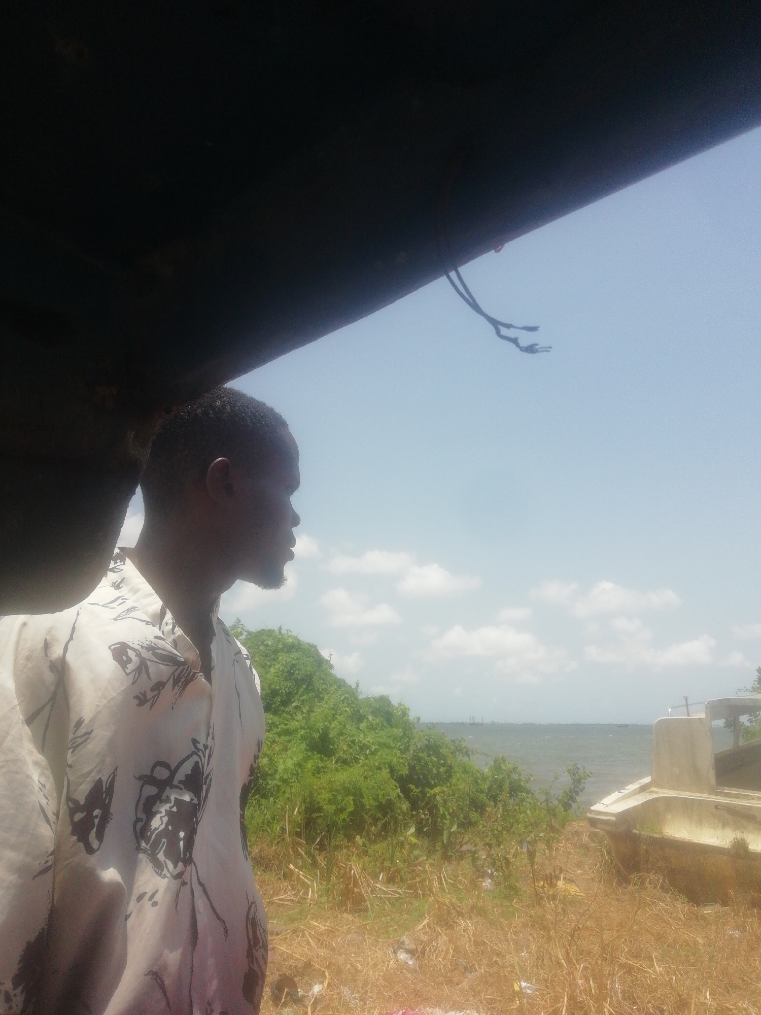man in a patterned white shirt looking out towards a body of water under a dark structure, possibly a roof overhang. Behind him are green bushes and tall, dry grass. A concrete structure resembling a boat or part of a building is visible near the water. The sky is blue with scattered white clouds. The location is unspecified.