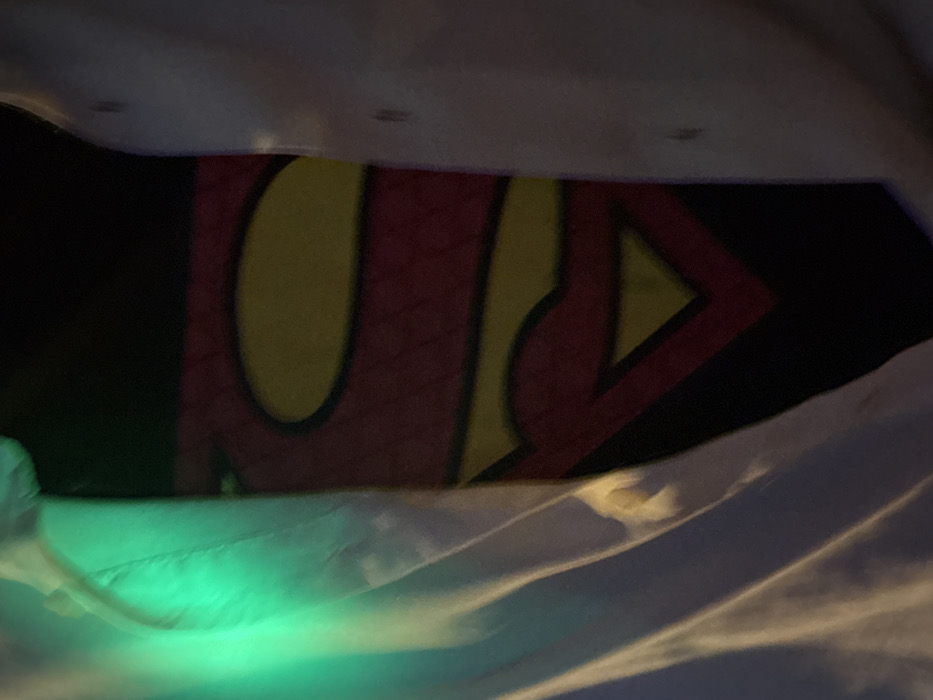 An individual is depicted from the upper torso region in a close-up, vertically oriented image, identified as being located in Naucalpan de Juárez, Mexico. The subject is wearing a black inner garment, specifically a t-shirt or shirt, featuring the prominent red and yellow "S" shield logo associated with Superman, which is partially visible. This inner garment is worn beneath an open, light-colored (likely white or light grey) button-up shirt or jacket. The fabric of the outer garment displays folds and creases. A distinct green light source illuminates the left side of the outer garment, casting a bright green hue. The background of the scene is dark and indistinct, suggesting low ambient light conditions. No other persons, actions, interactions, or specific environmental features beyond the clothing and lighting are discernible. The image exhibits minor blurriness.
