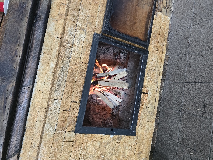 A stone-clad oven or fireplace structure is depicted in Panichishte, Bulgaria, viewed from a slightly elevated, oblique angle. The lower portion of the structure consists of a facade built with irregularly shaped, light brown to tan natural stone blocks. A central rectangular opening, framed in black metal, serves as a firebox, containing an active wood fire where several light-colored wood planks are visibly burning, producing flames and glowing embers. To the right of this firebox, a second rectangular opening, also framed in black metal, is present, displaying a dark, reflective surface within, consistent with a closed or partially ajar oven door. Above the stone work, dark, weathered wooden beams extend horizontally. The ground surface in front of the structure is paved with uniform grey square tiles. No individuals, specific actions, or interactions are visible within the scene.