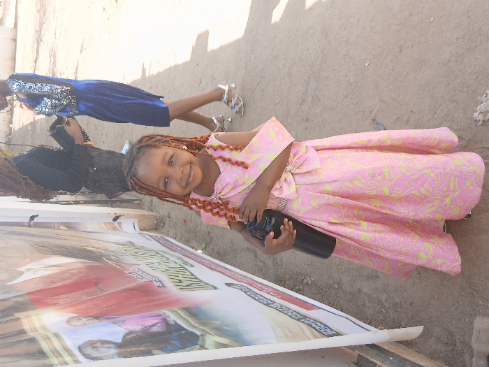 This image depicts an outdoor scene in Aviation Quaters, Nigeria. The foreground is dominated by a young female child of African descent, smiling directly at the camera. She has reddish-brown hair styled in numerous individual braids/twists. She wears a long, sleeveless pink dress with a light green abstract or floral pattern, featuring a large bow detail at the waist and a matching fabric piece draped over her left shoulder. A slender, silvery belt is visible at her waist. She holds a black, cylindrical object, resembling a water bottle, in her left hand. Behind the child, two adult females are partially visible. The woman on the left has long, curly brown hair and wears a dark long-sleeved top and dark bottom wear, holding a dark bag or object. Her face is obscured. The woman on the right wears a dark blue knee-length dress with long, silver sequined sleeves and silver high-heeled sandals. She appears to be turned away or in motion, with her face not clearly visible. To the left, a large white banner is visible, supported by a pole, featuring multiple color images of people, including a man in a suit, and text, part of which reads "ISHARE." The ground beneath the subjects is unpaved, consisting of light brown dirt or sand. The scene is illuminated by natural sunlight, indicating a daytime setting. A light-colored building or wall is partially visible in the distant background.