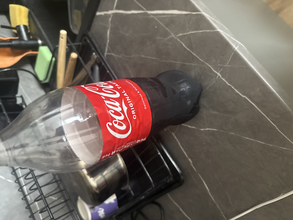 This image depicts an indoor kitchen scene located in Varna, Bulgaria. The primary subject is a clear plastic bottle of Coca-Cola Original Taste, approximately half-filled with dark brown liquid, positioned centrally on a dark grey countertop characterized by distinct white veining. To the immediate left of the bottle, a black metal dish drying rack contains a silver-colored metallic pot and a purple mug with a faint design. A black electrical cable is visible beneath the dish rack. To the right and rear of the Coca-Cola bottle, a kitchen sink area is partially visible, featuring a black faucet. Adjacent to the faucet, an orange kitchen utensil or accessory, a bright green rectangular sponge, and a yellow sponge are present. Two light brown wooden utensils are resting horizontally near the sink. A black rectangular object, possibly a smartphone, is lying flat on the countertop to the right of the bottle. No individuals or active interactions are visible within the frame. The lighting suggests an interior setting.