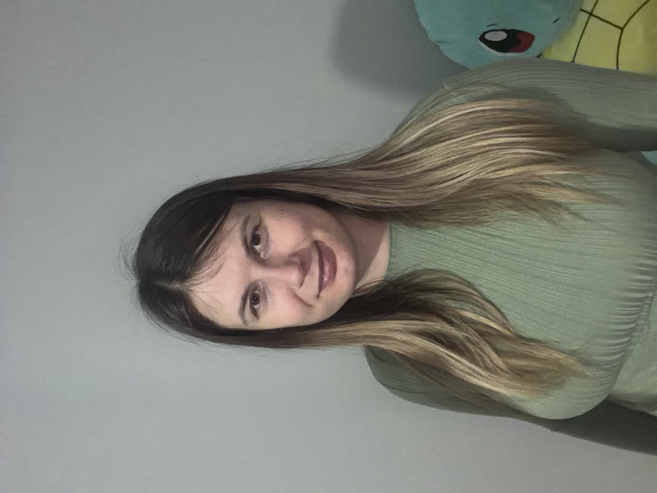 The scene depicts a single female subject captured in a headshot and upper torso portrait, positioned centrally against a plain, light grey wall. The specific indoor location within Stara Zagora, Bulgaria, cannot be determined from the visible details. **Person:** The subject is a female with long, straight dark brown hair featuring blonde highlights, parted near the center and extending over her shoulders. She has fair skin, brown eyes, and is looking directly at the camera with a slight smile. She wears a long-sleeved, light sage green top with a ribbed texture. **Objects:** Partially visible on the right side of the frame, behind the subject's right shoulder, is a plush toy. Its light blue head, red and white eyes, and a portion of its yellow and brown shell are discernible, identifying it as a Squirtle character. **Environment:** The background is an undecorated, light grey wall, suggesting an indoor setting. Illumination is even, providing clear visibility of the subject and background elements without harsh shadows. No specific architectural or decorative elements are present to indicate a precise room type or a specific address.