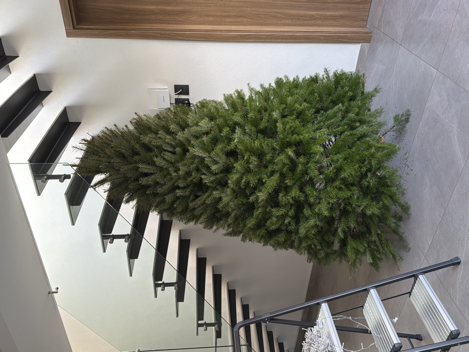 A freshly cut Christmas tree lies across a modern staircase. The tree, full and green, extends from the top landing onto several steps. The staircase features glass railings and cantilevered black steps. A ladder is partially visible in the foreground, leaning against a tiled floor. A wooden trim runs along the top of the adjacent wall. A wifi router is visible on the wall near the top of the staircase.