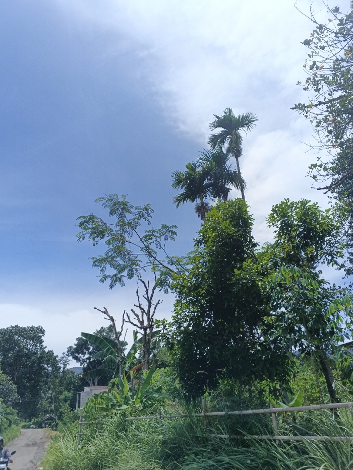 Lush greenery dominates the scene, with various trees and plants filling the frame. Two tall palm trees reach high into the blue sky, dotted with light clouds. A small road winds through the landscape, hinting at human presence. A wooden fence runs along the side of the road, separating the vegetation from the path. The overall impression is one of a vibrant, natural environment.
