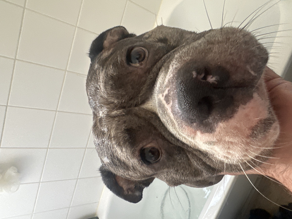 - "A brindle-patterned dog, resembling a bulldog-type breed, is captured in a close-up, head-on perspective, partially submerged in water within a white bathtub" by FM-clbjN2, licensed under CC BY 4.0
