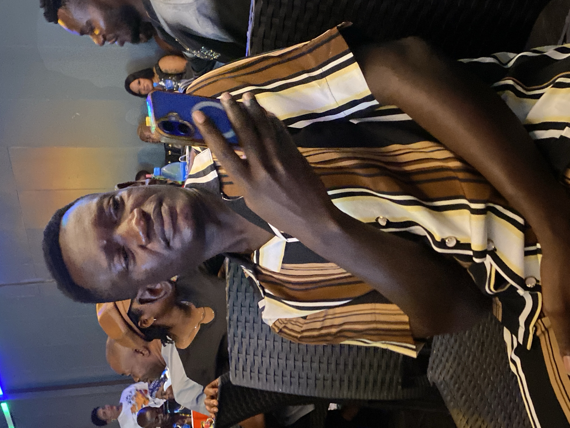 man holding a blue smartphone. He is wearing a brown, white, and black striped shirt with silver buttons. Several other people are visible in the background. The image was likely taken indoors, possibly at a bar or restaurant. The location in the city of Kubwa, Nigeria, is unknown.
