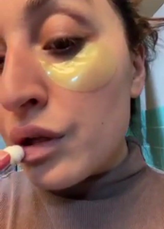 A woman with fair skin and dark hair pulled back from her face is shown from the chest up, looking mostly toward the camera and brushing her teeth with a white toothbrush. She is wearing a taupe-colored turtleneck top. She has a gold-colored eye mask under her left eye. The background is blurry and appears to be a bathroom. A blue and white tiled wall is visible to the woman’s right.