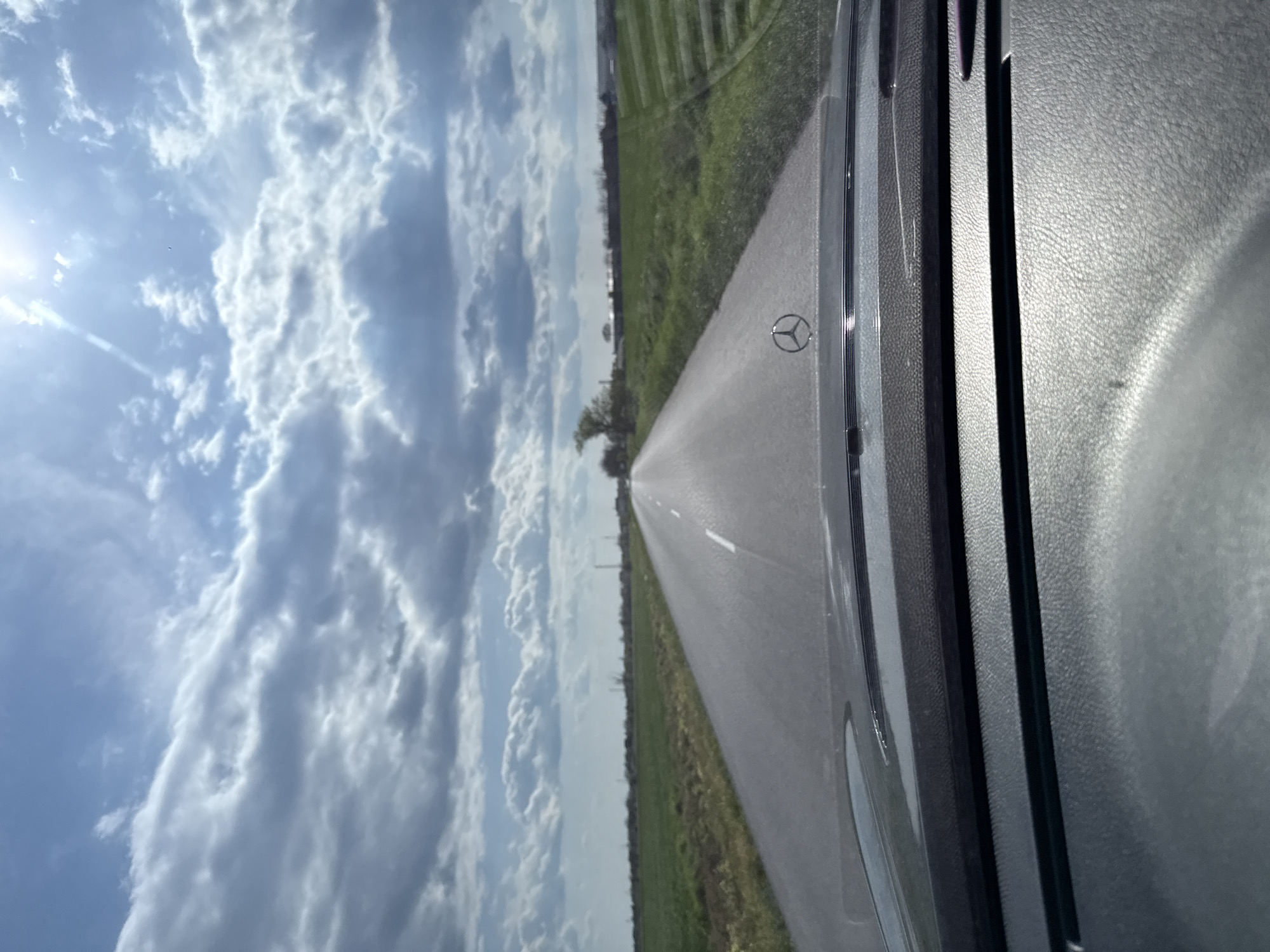 The image depicts a view from inside a vehicle, likely a car, driving on a paved road through a rural area near Sarnevo, Bulgaria. The road extends straight into the distance with a white line marking the center. The landscape on either side of the road consists of green fields. Above, the sky is blue with numerous white clouds. The sun is visible in the upper left corner. Part of the vehicle's interior is visible on the right side of the image, including the dashboard and trim. A Mercedes-Benz logo is visible on the dashboard near the windshield. There are no visible people or interactions.