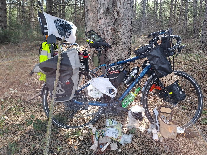 The scene depicts a heavily loaded touring bicycle in a wooded area near Dragoman, Bulgaria. The blue bicycle is leaning against a large tree trunk in what appears to be a pine forest with a ground covered in dry needles and sparse undergrowth. The bicycle is equipped for long-distance travel. On the rear rack, a grey and black pannier is visible, along with a yellow high-visibility jacket draped over the rear fender. A white flag featuring a black raven or crow's head over a skull, possibly with runic script, is mounted at the rear. The handlebars are fitted with a black dry bag, additional small pouches, and a navigation device. Several water bottles, including one with a skull decal and a green glass bottle, are mounted on the frame. A black bag wrapped with jute rope is secured to the front fork. On the ground directly in front and to the side of the bicycle's front wheel, an assortment of items is scattered. These include multiple plastic bags, various food wrappers, discarded packaging, and what appears to be food remnants such as lettuce leaves and bread. A beige fabric container holding cutlery and other utensils is also present. The overall arrangement suggests a recent stop for rest and a meal. The forest environment is characterized by numerous visible tree trunks and dappled sunlight. No individuals are present in the image.