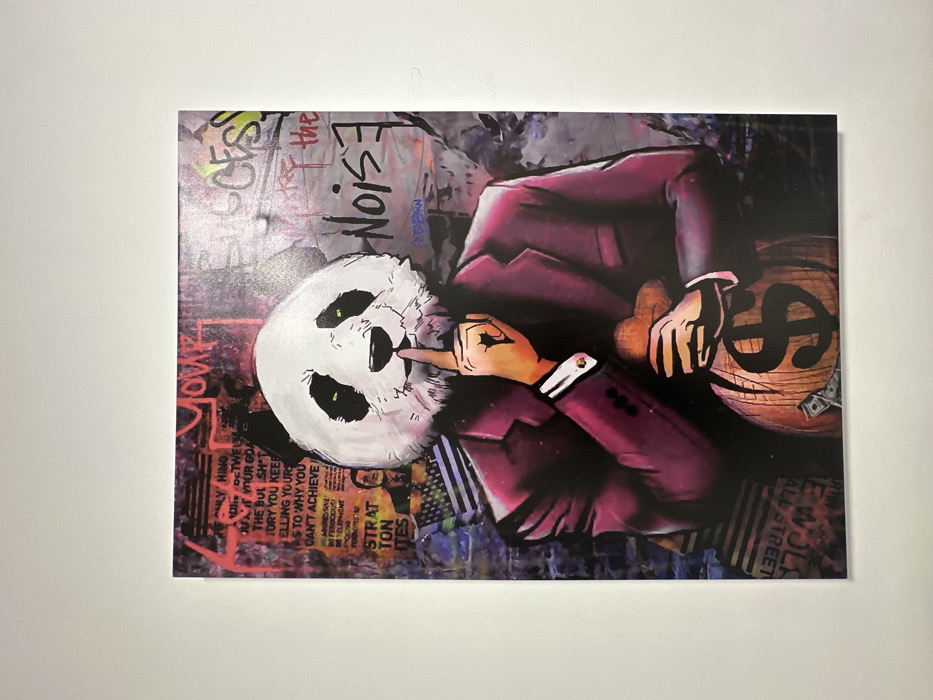 A vertically oriented pop art print is affixed to a plain white wall in Rishon LeZion, Israel