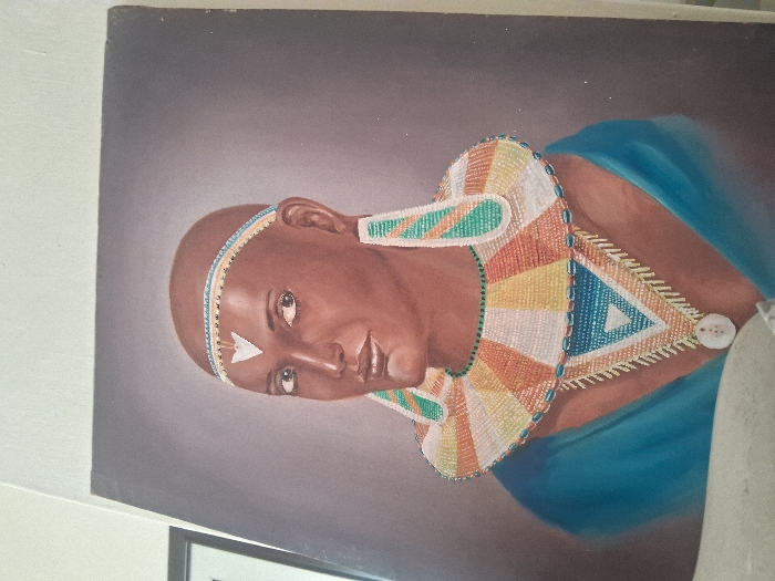 The image displays a photograph of a vertical portrait painting situated in an indoor environment in Ongata Rongai, Kenya