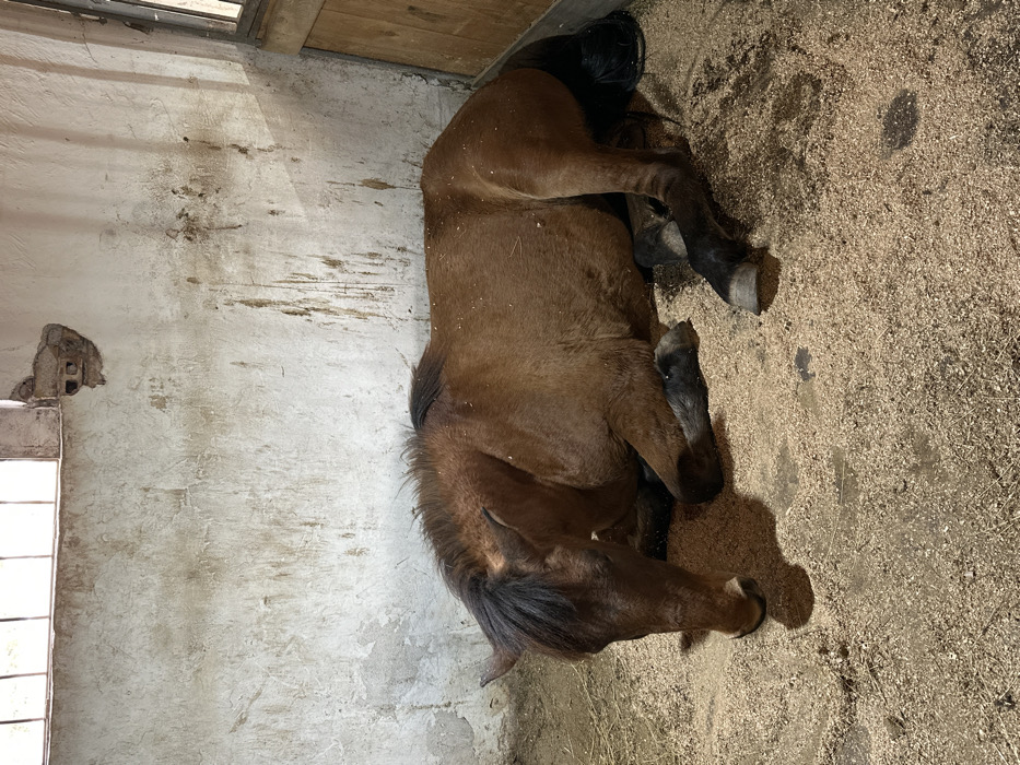 - "A single bay horse is observed lying on its right side within a stable or stall in Podlastva (Poljice), Montenegro" by FM-0NvqH2, licensed under CC BY 4.0