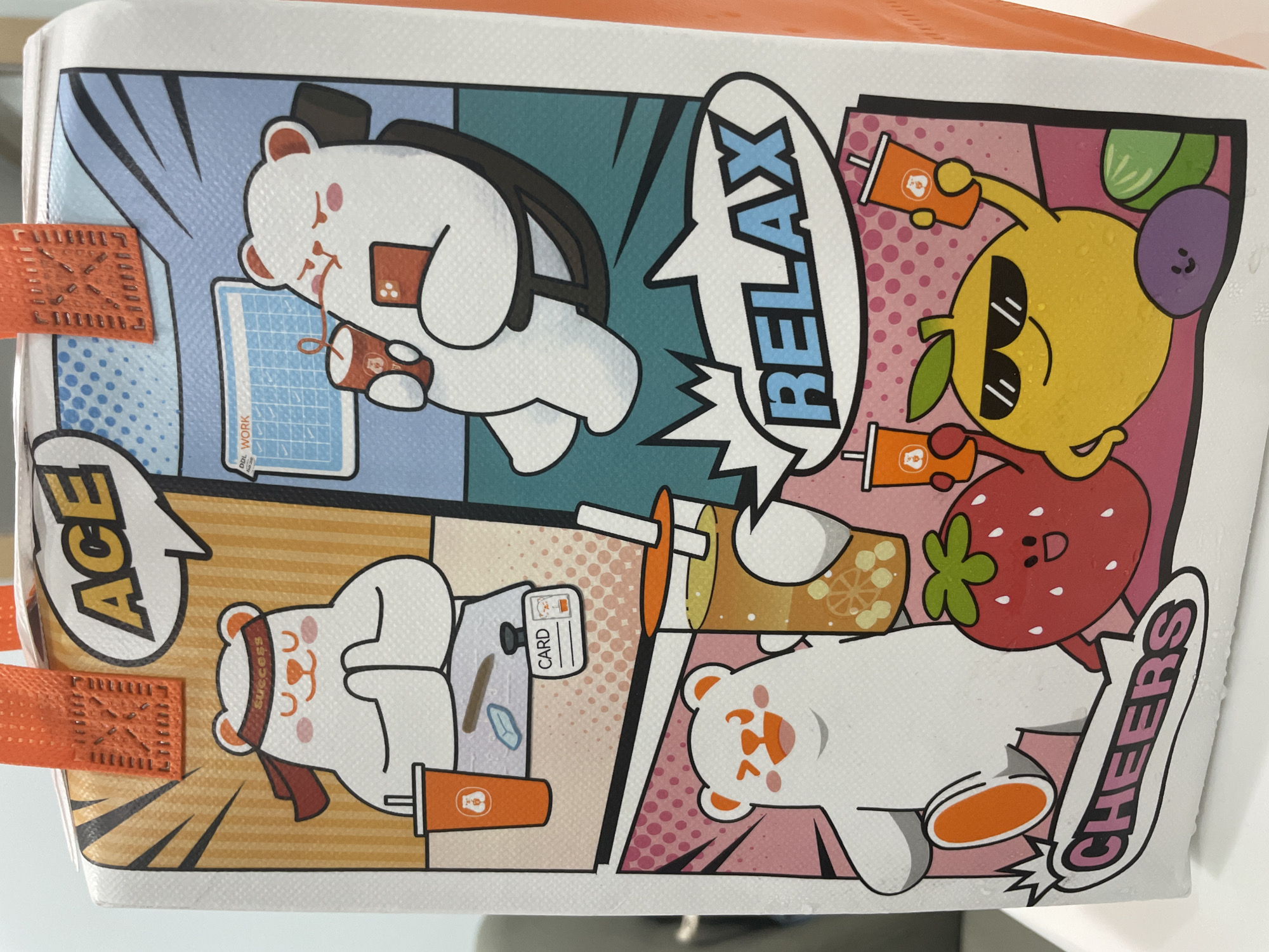 The image displays a white reusable shopping bag with bright orange woven handles and side trim, resting on a white, flat surface. The bag's front is adorned with a colorful, four-panel cartoon illustration featuring a white anthropomorphic bear. The top-left panel depicts the bear meditating with closed eyes and clasped hands, wearing a red headband labeled "success." An orange drink cup with a bear logo and a small white card labeled "CARD" with the same logo are positioned on a surface next to the bear. A speech bubble above reads "ACE" against an orange striped background. The top-right panel shows the bear seated in a dark brown chair, sipping from an orange drink cup with a red straw while holding a red smartphone. A white board labeled "DDL WORK" with a blue grid is visible in the light blue background. The bottom-left panel illustrates the bear with a wide smile, next to a large glass of bubble tea containing lemon slices and tapioca pearls, and a large red anthropomorphic strawberry with a happy face. A speech bubble states "CHEERS" against a pink halftone background. The bottom-right panel features a yellow anthropomorphic lemon character wearing sunglasses, raising an orange drink cup in a celebratory gesture, flanked by a smiling purple fruit and a green fruit. A "RELAX" speech bubble is present against a pink halftone background. The image was captured in Nha Trang, Vietnam.