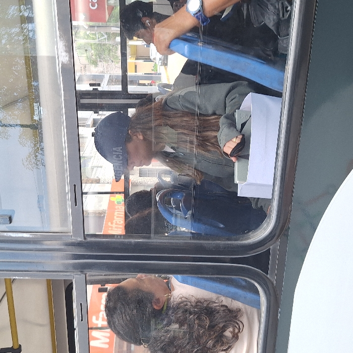 A bus interior featuring multiple passengers. In the foreground, a woman with curly gray hair is seated, reflected in the window. Above her, a younger woman with long, brown hair wearing a baseball cap is focused on a white paper bag, possibly holding something. Another passenger with short, dark hair and glasses is further back, holding onto a blue bar. The scene suggests an everyday commute.