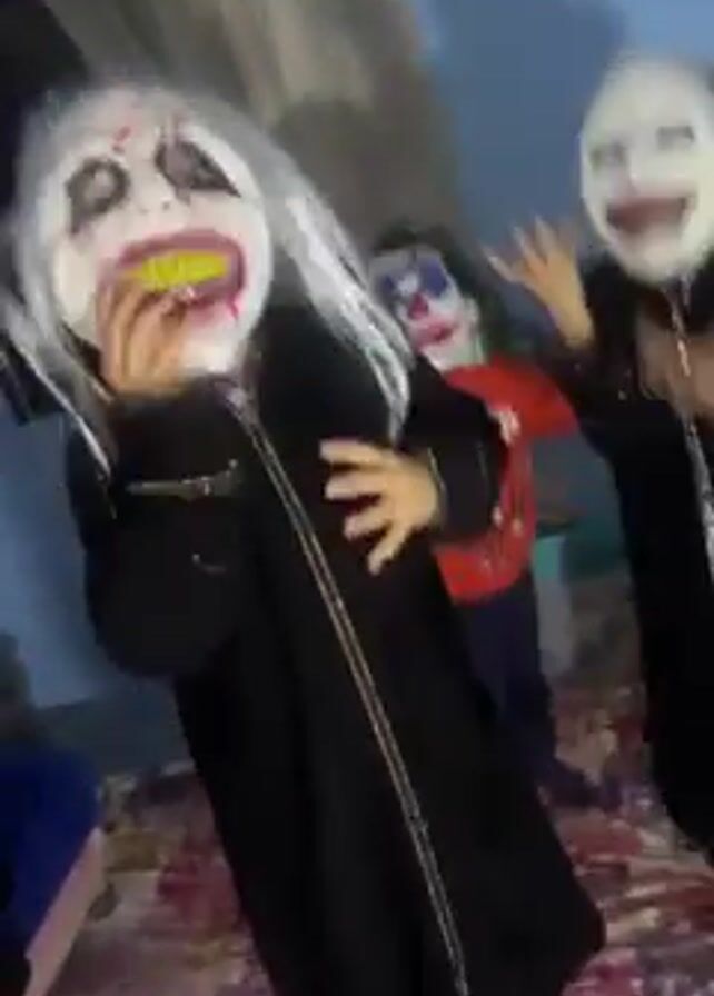 three children indoors, seemingly playing dress-up with Halloween costumes. Two children are wearing full-length black zippered jackets, and white creepy masks with painted red details around the eyes and mouth. The third child wears a clown mask with green hair and a red t-shirt. The children are moving erratically, with one eating or holding something yellow near their mask's mouth. The background shows a bedroom with a blue wall and a floral patterned carpet. A blue item is partially visible in the lower left corner. The lighting is somewhat dim.