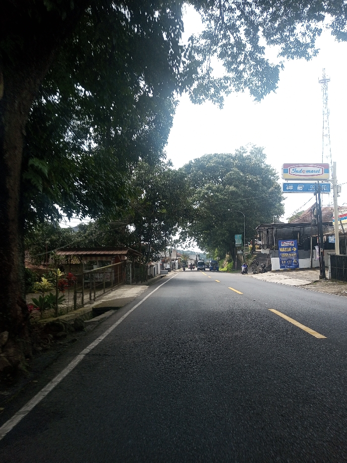 A daytime, eye-level perspective captures a two-lane asphalt road traversing a semi-urban or rural area in Niz Lakuk, India, under bright sunlight. The road features a solid white line on its left edge and dashed yellow lines in its center, indicating two-way traffic. On the immediate left, a large tree trunk with dense foliage partially shades the foreground. Further along the left, a concrete sidewalk runs parallel to the road, bordered by a low, dark fence. Behind the fence, a small structure with a corrugated metal roof and exposed wooden supports is visible, fronted by decorative plants with red and green leaves. On the right side of the road, a paved shoulder leads towards a commercial area. A prominent "Indomaret" sign, blue and red, is displayed on a pole, with a taller communications tower situated directly behind it. Another smaller "Indomaret" sign and a blue sign with white text, including "MASUK" (Entry) and an arrow, are positioned below the main sign. Several single-story buildings line this side of the road, and a motorcycle is parked near the Indomaret entrance. In the distant background, multiple vehicles, including a light-colored car or van and other darker vehicles, are visible on the road, which appears to curve gently to the right and slightly descend. The environment is illuminated by clear, bright daylight.