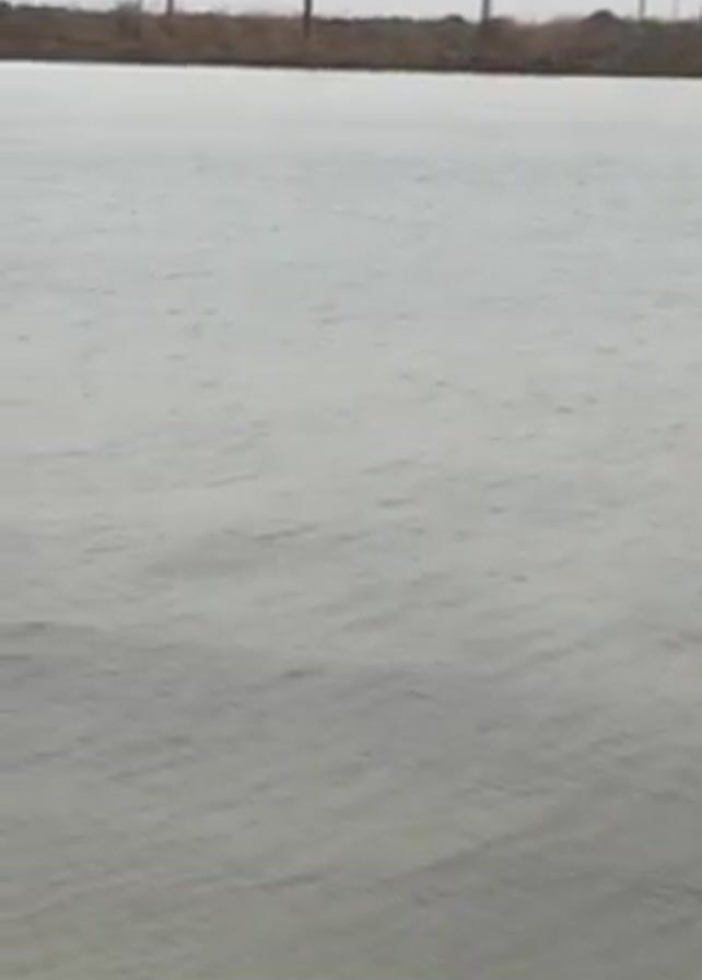 gray-colored body of water rippling in the wind. The water appears to reach the edge of a land mass in the distance, where there is a line of electrical poles. There are also a few bare trees visible in the background. The sky is overcast. At one point, a small object, possibly debris or a creature, floats briefly on the surface of the water.