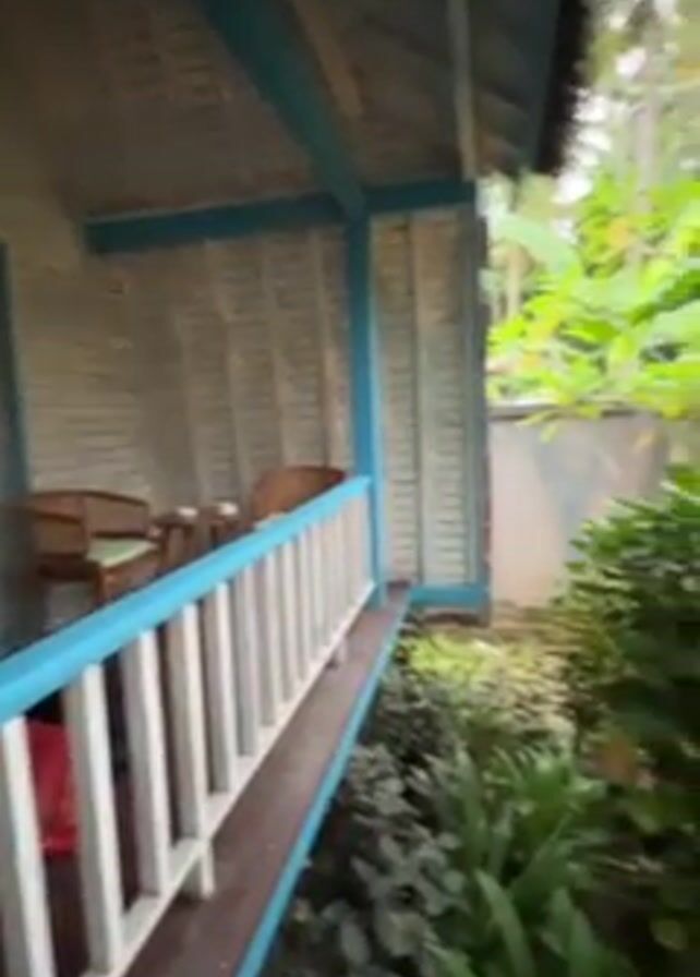 n outdoor area in what appears to be a tropical location. The shot starts on a porch with a white railing and a blue-painted frame. There are two wooden chairs and a small table on the porch. The camera then pans to the right, revealing a garden with lush green plants and several palm trees. The garden seems to be enclosed by a low wall. The sky is overcast.