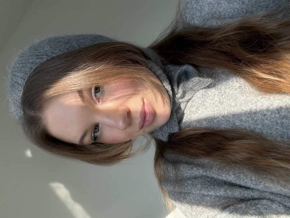 A close-up portrait features a young adult female positioned centrally, looking directly forward. She has long, straight brown hair, styled with some strands framing her face. She is wearing a grey knitted beanie that covers the top of her head and ears, secured with a tie forming a bow beneath her chin. Her attire also includes a grey knitted high-necked sweater. Her complexion is fair, with light-colored eyes and a neutral facial expression, featuring a slight upturn at the corners of her mouth. Minimal makeup is visible, including light eyeliner on her lower waterline. The background is a plain, light-colored wall. Strong sunlight from the left casts distinct linear shadows on the wall and illuminates the subject's right side, creating highlights on her hair and portions of her face. The scene is located in the City of Vozdovac Urban Municipality, Serbia.