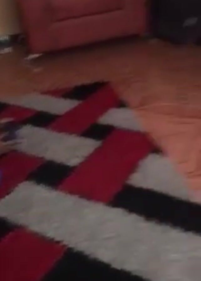 A young boy sits cross-legged on a patterned rug, playing a video game on a television. The rug has a bold pattern of black, red, and gray stripes. The boy is wearing a blue t-shirt and dark shorts. He holds a game controller in his hands and looks intently at the television screen. The television displays a fighting game with two characters engaged in combat. The TV is positioned on top of a wooden TV stand with drawers. The floor is tiled with brown tiles featuring a geometric pattern. In the background, part of a red couch is visible, as well as a black speaker. The camera pans slightly from the boy towards the television.