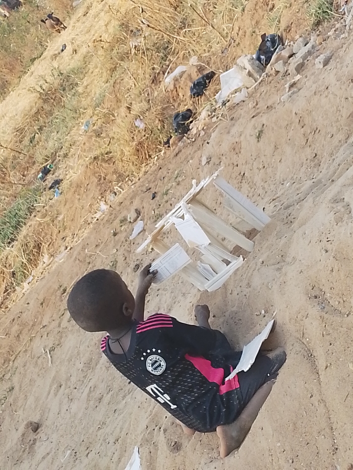 A child in a soccer jersey plays with debris on a sandy slope. A makeshift structure of white materials sits beside the child, who appears to be manipulating pieces of paper or cardboard. The background shows a grassy hill with scattered litter and dark bags or objects. The child is barefoot, kneeling amidst the sand and debris.