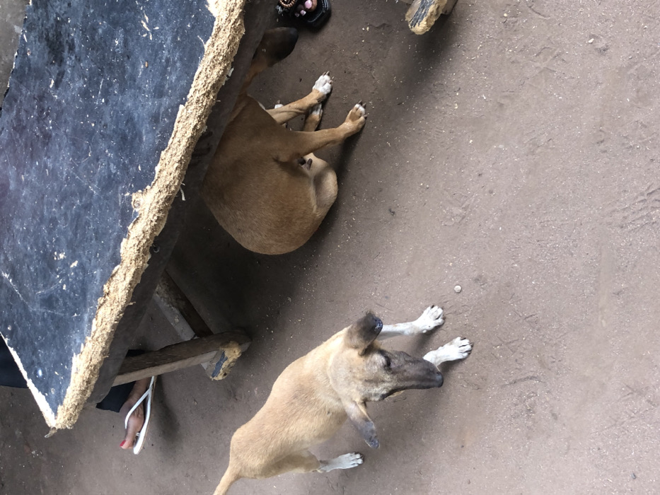 Two dogs rest on a dirt floor, with part of a worn, dark-colored wooden table visible