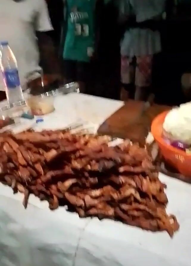 food stall set up at night, possibly outdoors. On a white tablecloth-covered table, there is a large pile of what appears to be cooked meat strips. Next to the meat is a wooden cutting board and a bowl of chopped vegetables. In the background, blurry figures of people are visible. To the side of the table is a grill with flames burning, suggesting the meat is being cooked. There are also bottles of liquid on the table. The scene gives the impression of a street food vendor preparing or serving food.