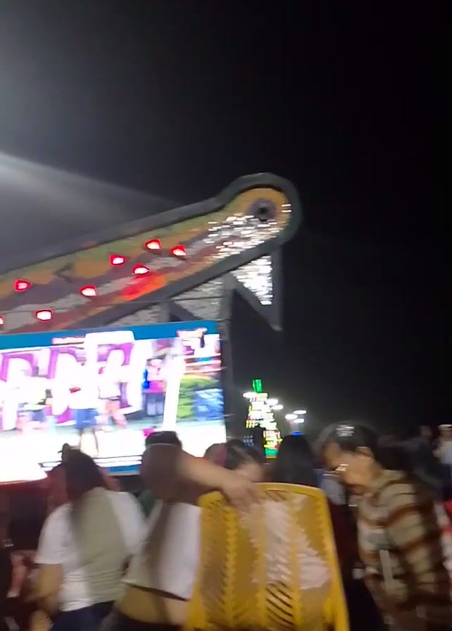 crowd of people at night, seemingly at an outdoor event or concert. There's a large screen displaying an image or video, along with a lit-up structure in the background. The crowd is dense and individuals are holding up phones, possibly taking photos or videos of the event. The lighting is dim, relying on the screen and structure for illumination. The camera is moving, giving a sense of the viewer navigating through the crowd.