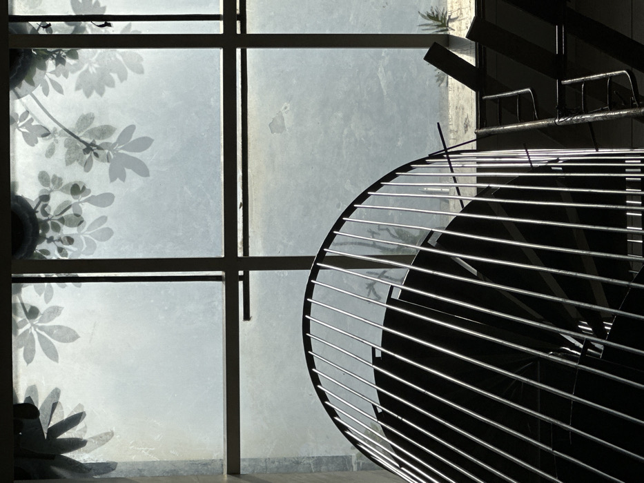 The scene depicts an interior architectural space in South Jakarta, Indonesia. A large, multi-paned window occupies the upper two-thirds of the frame, segmented by dark mullions. The window glass is translucent, allowing diffused exterior light and blurred forms to be visible. Shadows of foliage, including individual leaves and branches, are clearly cast onto the upper sections of the window panes. Through the lower-right section of the window, faint silhouettes of palm trees and a light-colored, hazy landscape are discernible. In the foreground, occupying the lower-left portion, is a prominent dark spiral staircase featuring numerous vertical, reflective metallic balusters that form a curved guardrail. To the immediate right of the staircase, in the lower-right corner, several dark, angular structural elements or beams are present, partially obscuring the view through the lower window. No individuals or active interactions are visible. Strong natural light originates from outside the window, casting elements into silhouette and creating highlights on the metallic surfaces.