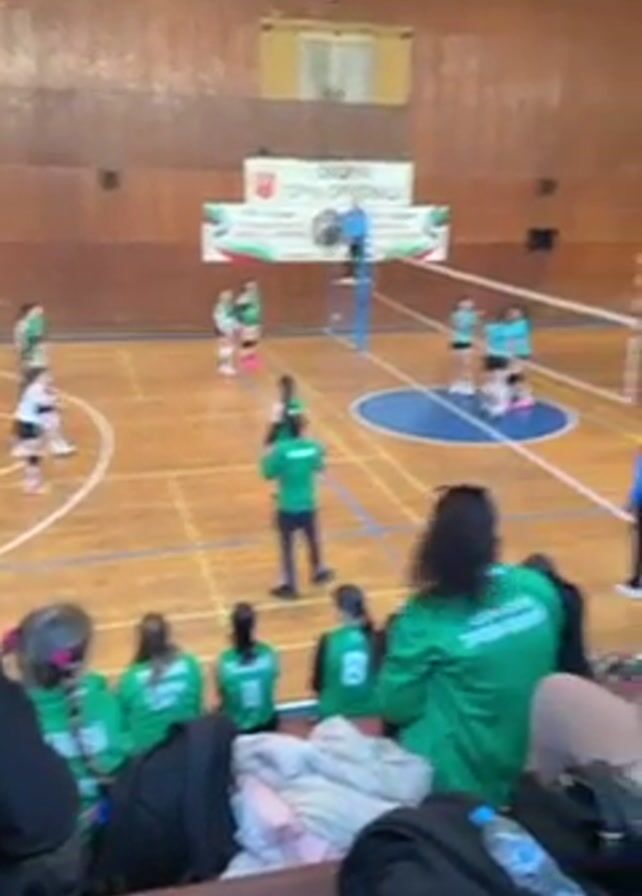 n indoor volleyball game in a gymnasium. Two teams of young women, one in green and the other in teal and black, are playing. The gymnasium has a wooden floor with blue markings and a net dividing the court. Spectators, some wearing green shirts, are seated on benches along the side. A coach in green stands on the court, seemingly directing the players. A banner hangs above the court. The camera pans slightly during the video, showing more of the spectators and the overall view of the game in progress.