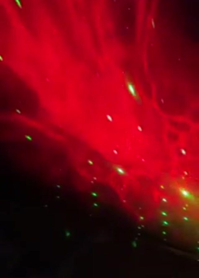 n indoor space with artificial lighting. The primary light source projects a nebula-like pattern onto a surface, cycling through colors including red, purple, and blue. Green laser points are also present, scattered across the same surface. The background is dark.