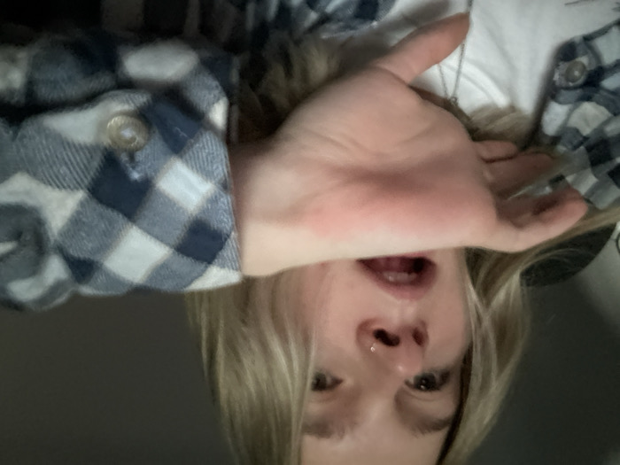 A person with blond hair and a blue and white checkered shirt faces the camera upside down. The person’s hand is raised toward the camera, partially obscuring their face. The person’s mouth is open and visible. A silver necklace can be seen against a white shirt under the checkered one. The background is a solid color.