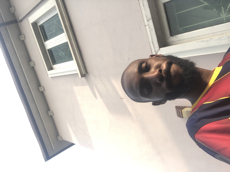 A man with a dark beard poses closely for a photo. He is wearing a dark blue and burgundy striped shirt. Behind him, a light-colored building is visible, featuring two windows. The window on the left has two panes, while the window on the right shows only one pane. The photo is taken at an angle, with the building appearing to lean. Sunlight illuminates the scene.