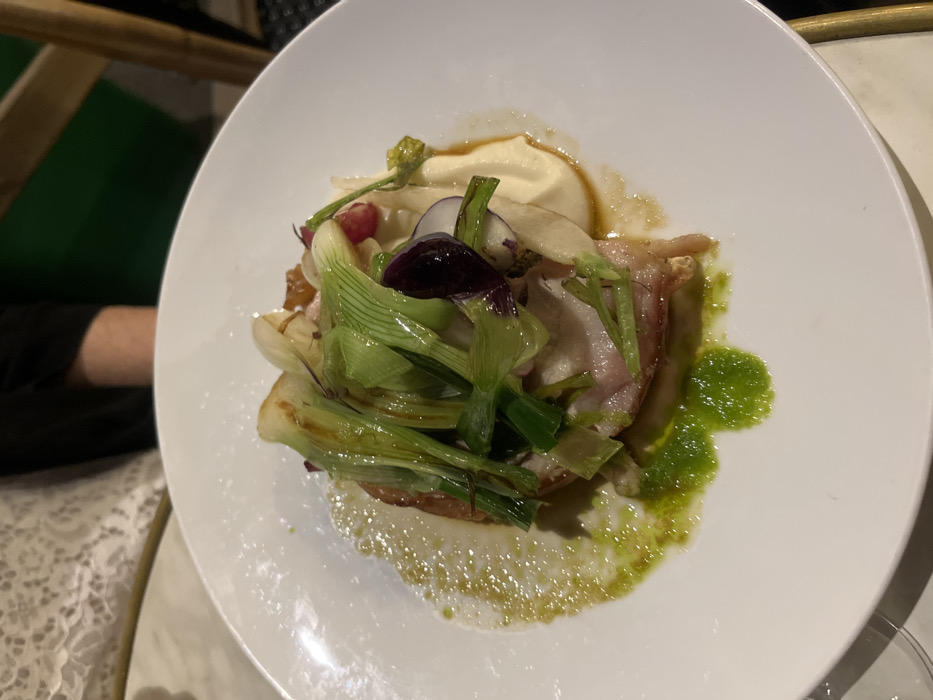 A white plate sits on a white marble table. It holds a plated dish of food. The dish is composed of a large piece of meat, green onions, mashed potatoes, and a green sauce. It appears to be a meal in a restaurant in Issy-les-Moulineaux, France. The location is determined by the coordinates (48.849, 2.325) which roughly correspond to the neighborhood of "Les Moulineaux" in Issy-les-Moulineaux. The image is captured from an overhead angle. The food is positioned in the center of the plate. An out of focus background is visible in the image.