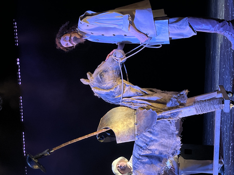 This image depicts a theatrical scene on a dark stage in Novoshakhtinsk, Russia. Two male actors are present alongside a stylized, weathered horse prop. On the right, a standing male actor, characterized by a dark, curly wig, a prominent thin mustache, and a short beard, wears a light-colored, long-sleeved tunic or jerkin, light-colored trousers, and dark, knee-high laced boots. He holds a white rope halter with his left hand, which is attached to the horse prop's head, and gently rests his right hand on the prop's forehead. His gaze is directed upwards and slightly to the right. The horse prop, positioned centrally, is constructed from wood and draped with textured, light-colored fabric, giving it a weathered appearance. Its visible legs are simplified wooden beams, partially wrapped with rope or fabric, and mounted on small casters. A piece of distressed metal or material, resembling rudimentary armor or a saddle, is affixed to the horse's back. Extending upwards and left from behind this saddle-like element is a long, slender staff or lance, topped with a small, dark, helmet-like object. Partially visible on the left side of the horse prop, from the chest up, is a second male actor. He is seated on the prop and wears a light-colored, wide-brimmed hat and light-colored clothing. The environment consists of a uniformly dark background, characteristic of a theatrical stage. The subjects are illuminated by stage lighting, which casts a blueish tint on the fabrics and details. A horizontal row of small, purple-tinged stage lights is visible near the top of the frame. The stage floor is dark and minimally lit.