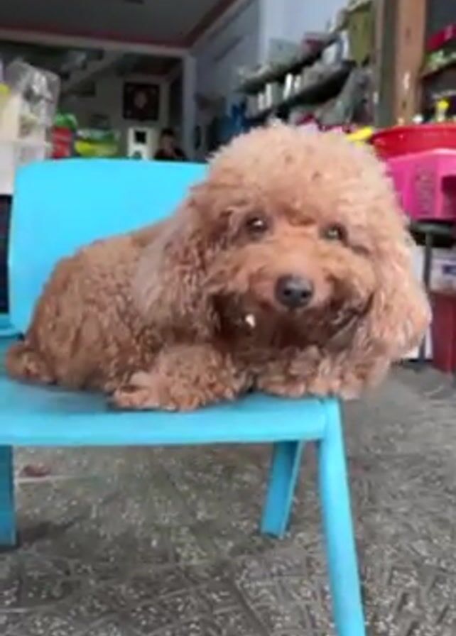 small brown poodle sitting on a bright blue plastic chair. The dog is facing the camera with a sweet expression, appearing relaxed. The background reveals an open-front store or shop, with shelves stocked with various goods and a person walking in the background. The overall setting seems to be an outdoor market or commercial area.